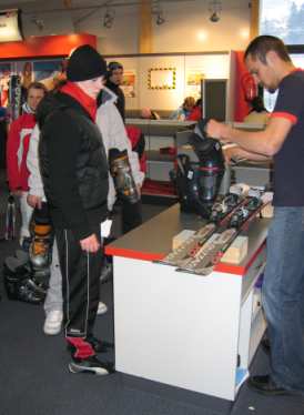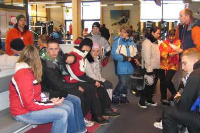 Nachdem die Schülerinnen und Schüler und auch die drei betreuenden Lehrer Herr Heckers, Herr Herz und Herr Paprottka ihre Zimmer bezogen hatten, gingen wir gemeinsam zu dem direkt an der Talstation gelegenen Skiverleih, welcher in fünf Minuten Fußmarsch vom Mühlenhof entfernt liegt, um Ski und Skischuhe auszuleihen. |