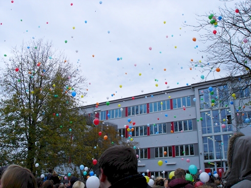 In der Abschlussveranstaltung beeindruckten uns ein Chor der Fachschule für Sozialpädagogik, der Auftritt von zwei Rappern sowie eine Fotodokumentation der Freizeitsportleiterklasse FA13A. Die SV hatte in mühsamer Handarbeit Ballons mit Gas befüllt und mit Kordeln bestückt, an die die Schülerinnen und Schüler Zettel mit ihren persönlichen Begründungen gegen Rassismus hefteten und gemeinsam in den Himmel über der Schule steigen ließen.