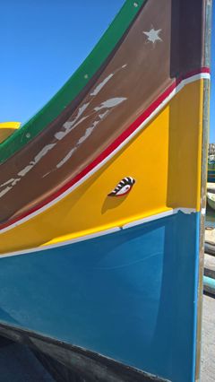 Foto: ein altes Fischerboot in Marsaxlokk mit dem berühmten Luzzu-Auge